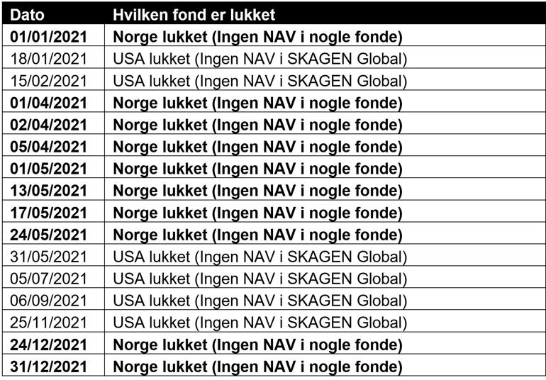 Fra næste år ændrer SKAGEN retningslinjerne for, hvornår vi fastsætter kurser. Ændringerne indebærer, at der ikke vil blive fastsat en kurs, når markederne, som udgør en betydelig del af porteføljerne er lukkede. Der vil heller ikke være åbent for at tegne og indløse på disse dage. Fondene vil fortsat være lukkede på officielle helligdage.