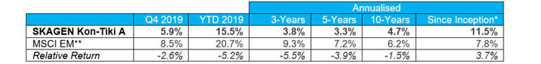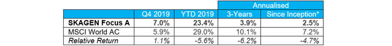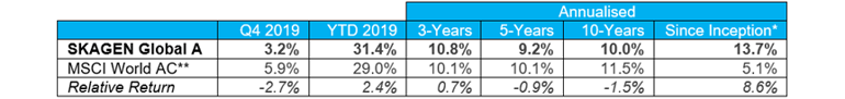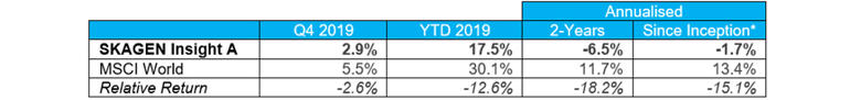Insurance holdings weak in fourth quarter but strong absolute and relative 2019 returns. SKAGEN Global A climbed 3.2% over the quarter, underperforming the MSCI All Country World Index which rose 5.9%.