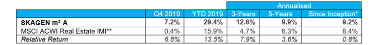 Nordic holdings drive absolute and relative gains as three US companies enter the portfolio. SKAGEN m² A increased 7.2% during the quarter, outperforming the MSCI All Country World Index Real Estate IMI benchmark which was up 0.4%.