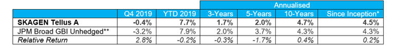 UK, South Africa and Mexico holdings perform strongly as USD and JPY weakness drives relative gains. SKAGEN Tellus A fell 0.4% in the quarter, outperforming the JPM Broad GBI Unhedged index which dropped 3.2%.