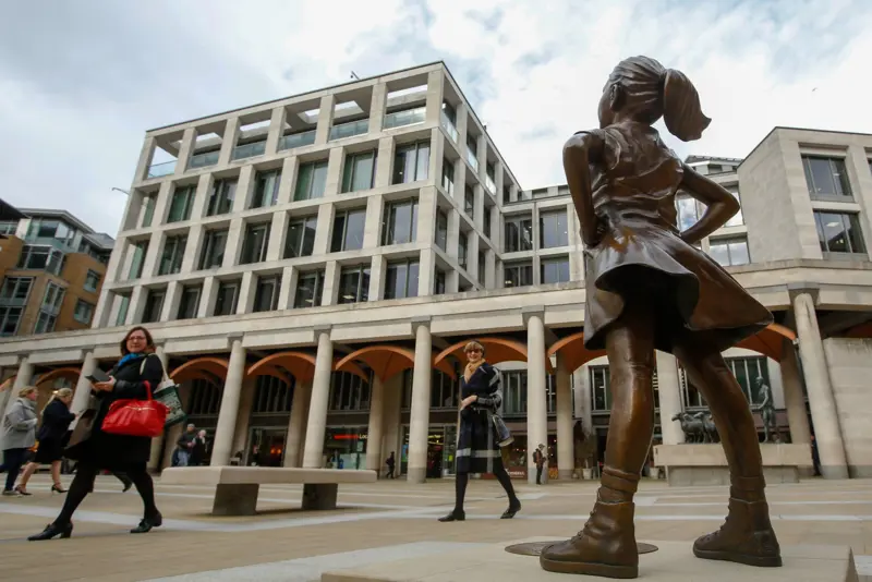The "Fearless Girl" sculpture by Kristen Visbal looks towards the London Stock Exchange Group. Photo: Bloomberg