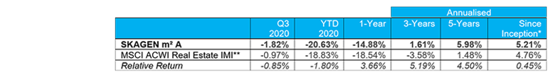 SKAGEN m² A fell 1.82% during the quarter, underperforming the MSCI All Country World Index Real Estate IMI benchmark index which dropped 0.97%.