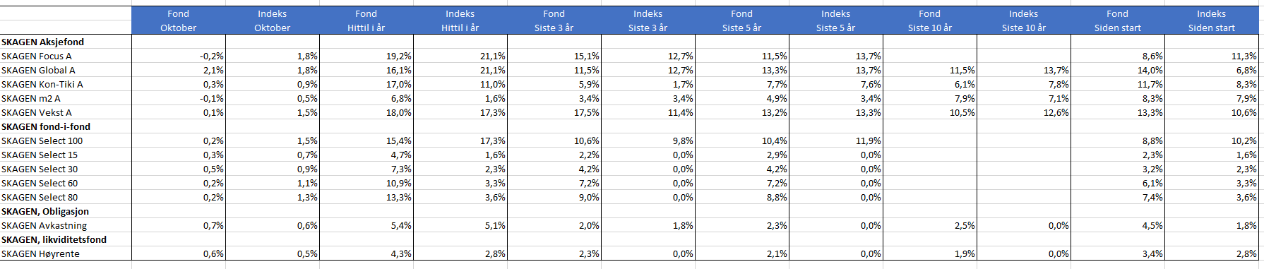 Vekstmarkedsfondet SKAGEN Kon-Tiki steg 0,3 prosent i oktober, mot indeksens 0.9 prosent. Flere avkastningstall finner du nederst i artikkelen.