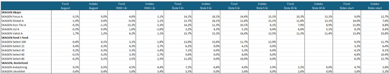 SKAGEN Kon-Tiki fortsatte den sterke trenden i august og slo referanseindeksen for åttende måned på rad. I august falt fondet tilbake 0,3 prosent mens indeksen falt 1,1 prosent. Se nederst i artikkelen for flere avkastningstall.