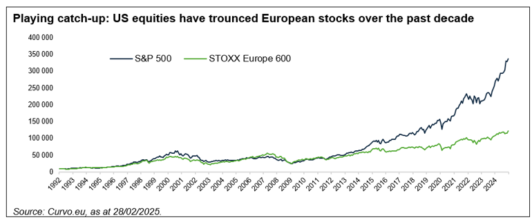 Etter en sterk start forventes nå Euro Stoxx å bli den best presterende indeksen i år, ifølge 22 % av respondentene i Bank of Americas undersøkelse fra februar, mens Nasdaq ligger på 18 %. Selv om en europeisk triumf i 2025 kan se lovende ut, vil den lange dominansen til de amerikanske aksjene fortsette. S&P 500s totale avkastning er nemlig mer enn dobbelt så høy som for Euro Stoxx 600 siden markedene begynte å divergere i 2012.