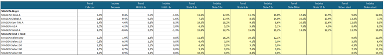Fondet leverte sterk absolutt avkastning og slo referanseindeksen klart. SKAGEN Vekst steg 1,0 prosent i februar, mens indeksen falt 0,6 prosent. Se flere avkastningstall nederst.
