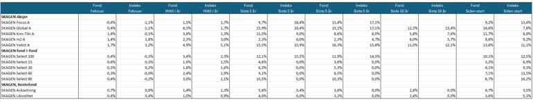 Februar var preget av usikkerhet knyttet til tollsaker og geopolitiske spenninger i de globale aksjemarkedene. Likevel klarte forvalterne i SKAGEN Vekst å slå referanseindeksen, blant annet takket være gode kvartalsresultater fra flere sentrale selskaper og begrenset eksponering mot det amerikanske markedet. Fondet endte måneden med en avkastning på 1,7 prosent mot 1,2 prosent for indeksen. Se nederst i artikkelen for flere avkastningstall.