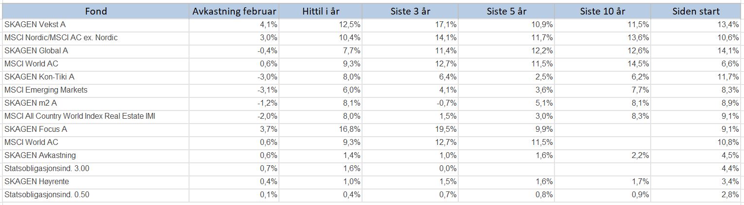 Det globale aksjefondet SKAGEN Global falt tilbake 0,4 prosent i februar, mens indeksen steg 0,6 prosent i måneden. Flere avkastningstall finner du nederst i artikkelen.