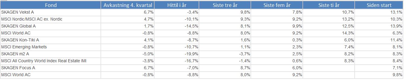 Det nordisk-globale aksjefondet SKAGEN Vekst slo sin indeks i kvartalet. Fondet presterte 6,7 prosent avkastning i fjerde kvartal, mot indeksen 4,7 prosent. Flere avkastningstall er nederst i artikkelen.