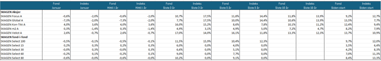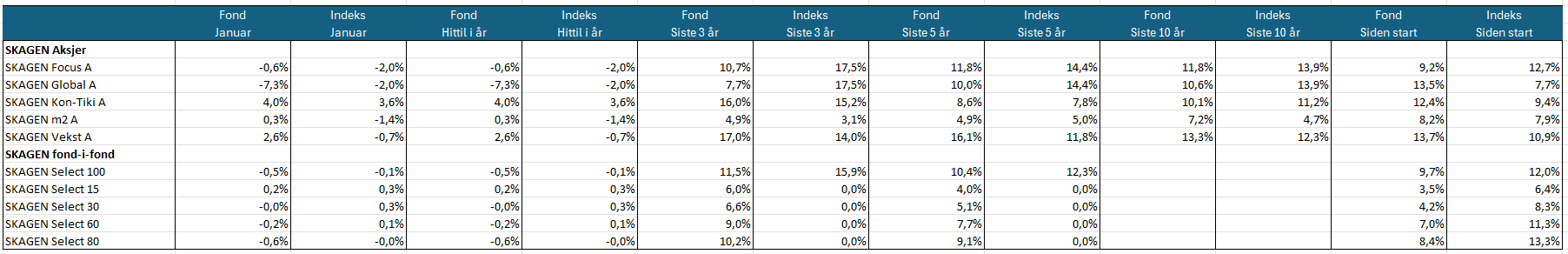 SKAGEN Vekst leverte solid absolutt avkastning i januar og endte godt foran referanseindeksen, til tross for at en sterkere norsk krone ga motvind for NOK-baserte investorer. Fondet oppnådde 2,6 prosent avkastning i januar, mens indeksen falt 0,7 prosent tilbake. Se flere avkastningstall nederst i artikkelen.
