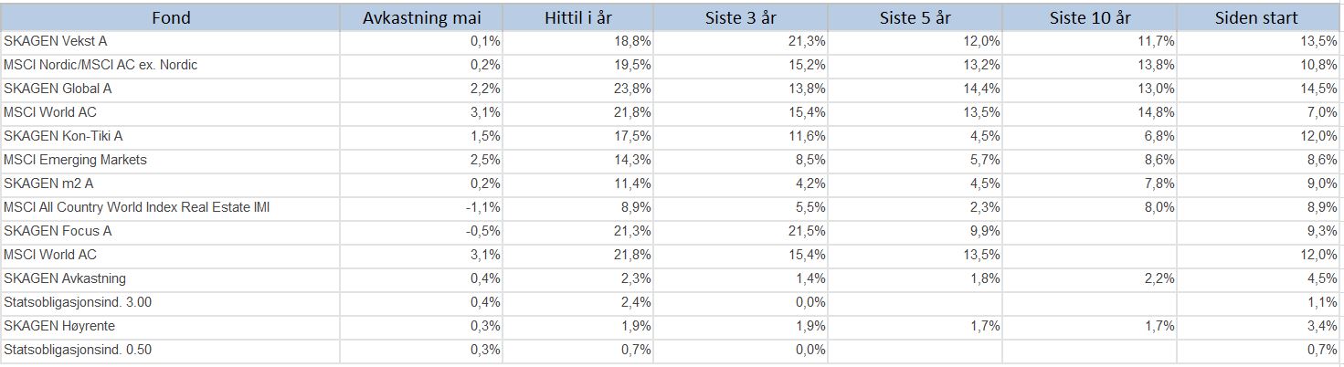 Vår nordiske/globale fond SKAGEN Vekst ga 0,1 prosent avkastning i mai, litt bak indeksen som endte på 0,2 prosent. Se avkastningstabellen nederst.
