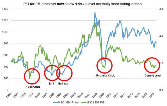 Som på alla fester, finns det några som inte ger upp och väntar på minsta tecken om att "nu ska vi ha kul." År 2016 inleddes med en knall och påföljande aktiefall, men vändningen och förnyad optimism kom snabbt. Är ökenvandringen över? På kort sikt kan det naturligtvis vara en hägring, men för tillfället verkar de största problemen ha försvunnit. Efter åratal av stark expansion prioriterar åter företagen i tillväxtmarknaderna avkastning på eget kapital, och en varaktig nedgång tycks ha avstannat. Dessutom ligger värderingarna, trots en viss återhämtning i början av året, kvar på krisnivåer (se grafen).