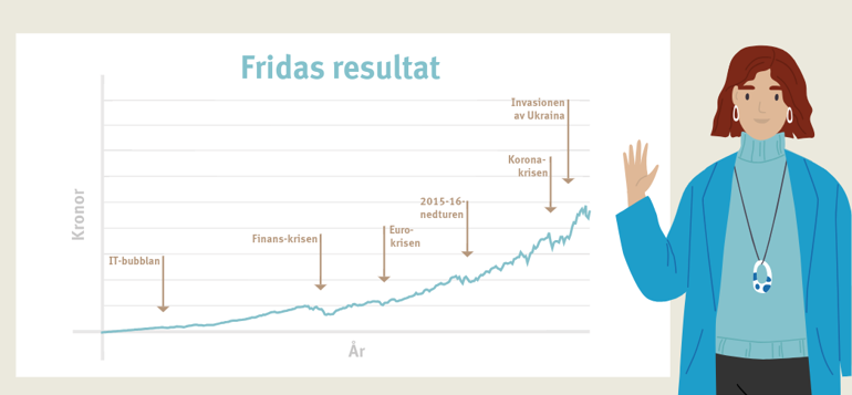 Frida är inte särskilt glad över tajmingen, för att uttrycka det milt. Med åren visar det sig att hon konsekvent slår till vid sämsta möjliga tidpunkt: Det börjar med att hon köper fonder på högsta nivå innan dotcombubblan spricker, och hon har lika otur senare när finanskrisen, eurokrisen, nedgången 2015–2016, coronapandemin och när Ukraina-invasionen inträffar.