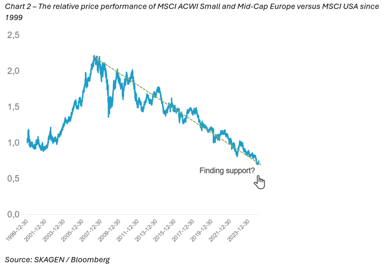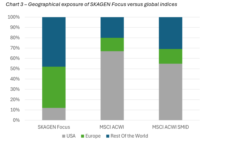 There are several indicators that a substantial rotation is underway in global equity markets that could potentially signal a larger shift out of US stocks into discounted and ignored equity markets overseas. Year-to-date the so-called Magnificent 7 are down 13 percent, the US equity market is down 4 percent while European equities are up 8 percent[1]. The vast amounts of capital invested into passive global equity mandates during the last ten years, which are yet to take notice, have the potential to accelerate the rotation. We believe the largest potential upside lies in small and mid-cap areas in Europe but also elsewhere outside the US, especially in the cyclical elements of the global investment universe. In this scenario, SKAGEN Focus is well positioned to generate value for our unitholders over the next few years.