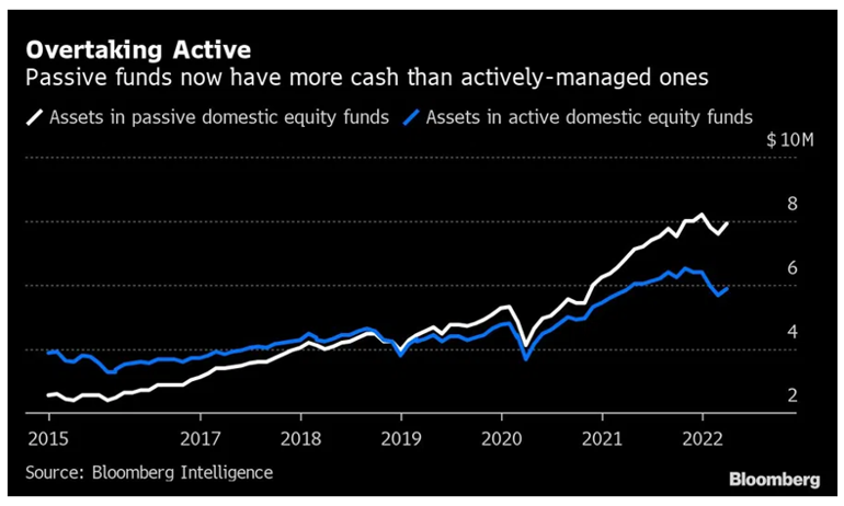 The rapid growth in passive investing has been one of the most significant fund management industry trends of the last decade, alongside (and driving) fee compression and the rise of sustainable investment strategies. In the world's largest equity market, assets in passive equity strategies overtook those in active ones in 2019 and today have around 58% share of the $13.8 trillion market according to Bloomberg: