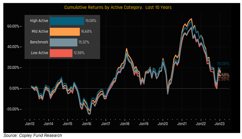 Meanwhile, analysis this year by Copley Fund Research of 278 emerging market funds found them to have generated cumulative 10-year alpha of 2.76% on average, with funds in the highest active category delivering the best relative performance (+3.76%) over this time.