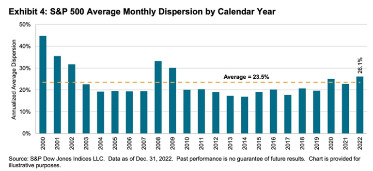 Active investors' chances of success increase when correlation – a measure of how stocks move in relation to one another – is low as this suggests that company-specific rather than macroeconomic news is driving returns. More important for stock pickers is dispersion – the extent to which stocks move in relation to the market average – with high dispersion indicative of a greater opportunity set to beat (and also underperform) the market. In 2022 stock dispersion among constituents of the S&P 500 index was its highest since 2009, creating the conditions for active managers to reap the rewards of successful stock selection.
