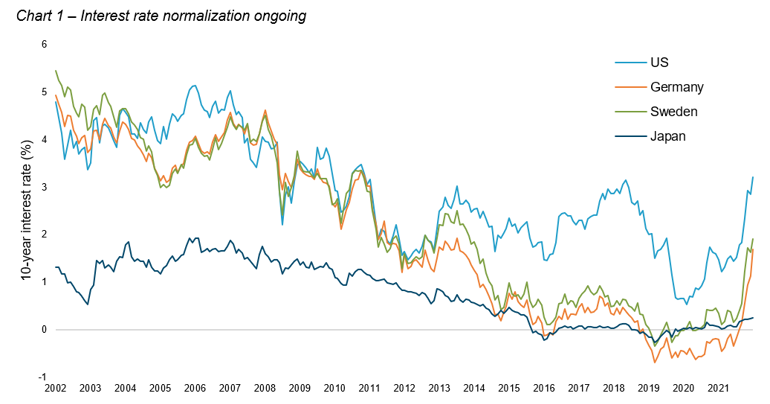 1. The ultra-low interest rate environment drove the investment community's entire focus towards companies with specific characteristics. The multiple expansion in these industries globally soared to record levels at the end of 2021. Since then, we have witnessed a large correction in bond prices in most countries and inflation has climbed above 8 percent in the US and appears to be stickier than anticipated by central banks. The change in the interest rate environment is now forcing investors to focus on higher mid-term earnings yields that can compete with a risk-free bond rate of 3 percent or higher. We are now in the midst of a rotation into stocks with lower valuation multiples at the expense of the elevated areas of the global equity markets.