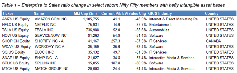 5. Excessive focus on intangible asset values has been a prevailing argument for elevated multiples in several industries. It is indisputable that intangible assets clearly have some economic value for the likes of software companies or those selling branded consumer goods. Tech companies have ploughed billions of dollars into intangible asset bases where the actual return on these investments is an unknown. The falling multiples of these stocks can be interpreted in many ways, but clearly the market is currently in a de-rating mode when it comes to intangible asset bases, much like the ongoing de-rating of non-profitable companies overall.
