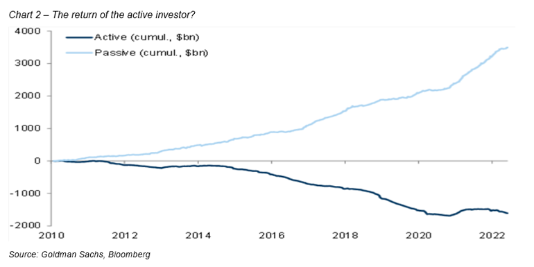 3. The massive capital flows into passive investment vehicles are a notable anti-value factor as passive vehicles direct capital flows towards the largest capitalised companies irrespective of valuation of an asset. The underperformance of value over the past decade coincides with the USD 5 trillion rotation from active to passive management[1]. The dominance of passive investments is illustrated in the chart below. However, as the investment environment normalises and the playing field becomes more even, we are starting to see signs of investors returning to actively managed mandates, and specifically those that are value-based. A recent report found that almost 70% of active US mutual funds are outperforming the S&P Index this year[2]. Investors are also discovering that global index mandates are poorly diversified as the concentration risk from major markets such as the US has never been higher.