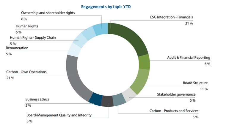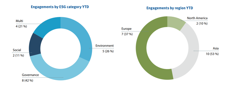 During the quarter, there was a particular focus on governance-related ESG topics. Engaging on governance topics does not mean neglecting discussions of a more environmental or social nature, but rather improving the latter two parameters through improved governance.