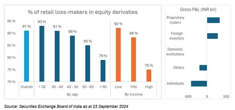 Worryingly, a recent report from the Securities and Exchange Board of India shows that this has not been a welcome development for the average investor. In fact, 91% of retail participants lost money trading derivatives in the last financial year. Moreover, the share of loss-makers was highest amongst younger and lower income groups. As such, the behaviour appears more of a “get rich quick scheme”, with its invariable end result, than a sustainable investment strategy, in our view. On the other side of the trade are both foreign and largely algorithmic-based proprietary (e.g. professional) investors who appear to be making large profits at the expense of individual investors.