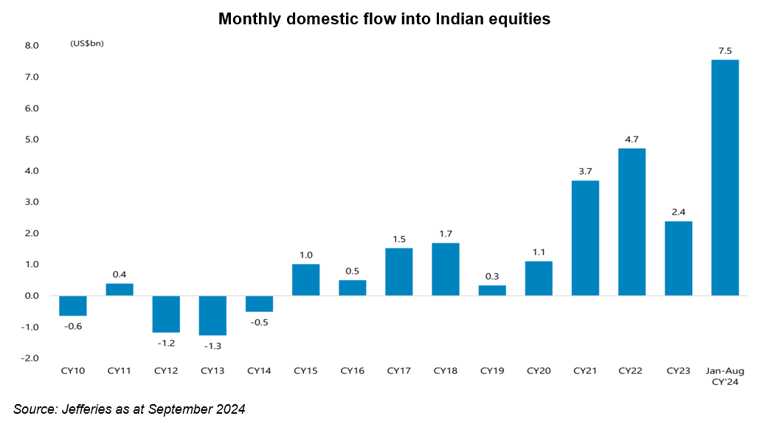 This dynamic matters as it is the Indian retail investor who is currently driving the Indian equity market ever higher. Annual inflows into domestic mutual funds and equities have increased rapidly over the last five years and look set to break last year’s figure at the half-year stage[3].