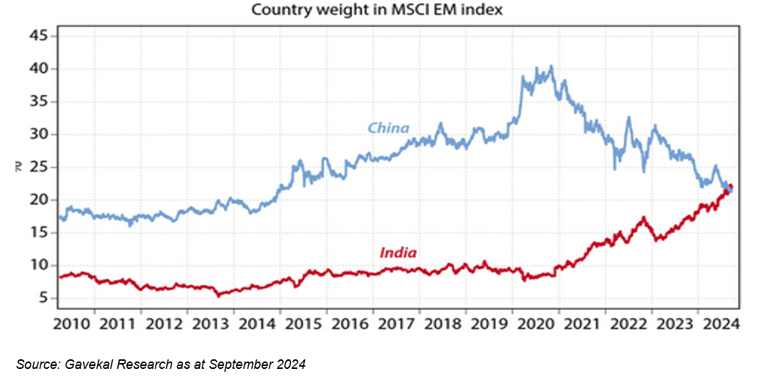 So much so, that the weight of India in the MSCI EM index overtook that of China, an economy almost five times as large, in early September.