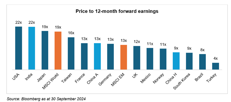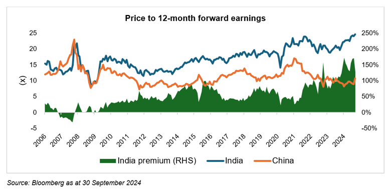 However, as value-based and contrarian investors we are always cognizant of the price paid relative to the value we can expect to receive in the future. And here, the picture is less clear-cut. On simple measures such as price to earnings, MSCI India is currently trading at its highest level relative to 12-month forward earnings, while MSCI China is trading close to its lowest point over the last ten years. India is not only trading at a significant premium to its own history, it is also elevated relative to other markets around the world, and therefore a clear outlier in terms of the price investors are willing to pay for future earnings.