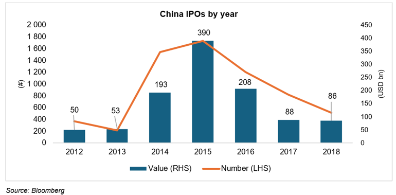 Unfortunately, or perhaps unsurprisingly, this euphoric state did not last. Regulatory clampdown on high-risk investor behaviour (including margin financing) and a sharp rise in equity supply through IPOs and insider selling eventually overcame investor demand, especially as China’s economic performance failed to live up to elevated expectations. As seen in the chart below, both the number of transactions and size of new equity issuance grew significantly as the market rose during 2014 and 2015.
