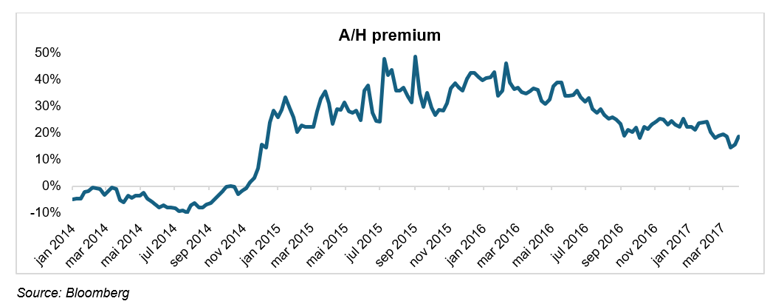 The run-up in Shanghai and Shenzhen was largely driven by domestic retail investors who pushed valuations to previously unseen levels. To put this into context, dual-listed companies[2] saw their domestically traded shares go from trading at a 10% discount to the same shares in Hong Kong to a near 50% premium in the space of 12 months. Such was the power of the Chinese retail investor when she got the taste for equities.