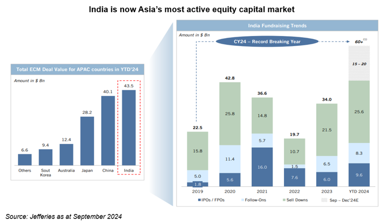 According to Jefferies, India is currently Asia’s busiest market for equity capital markets (ECM) transactions with the pace of both new listings and sell-downs by existing owners having increased materially. Of equity raised in the first half of 2024, 12% was primary issuance through an IPO while almost 70% was from private equity or promoter (e.g. insider) exits.