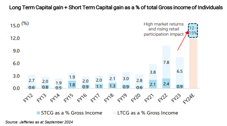 Given the importance of domestic retail flows for equity valuations and Indian households’ growing reliance on capital gains as a source of income, we believe that such a risk is currently ignored by the market.