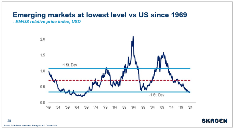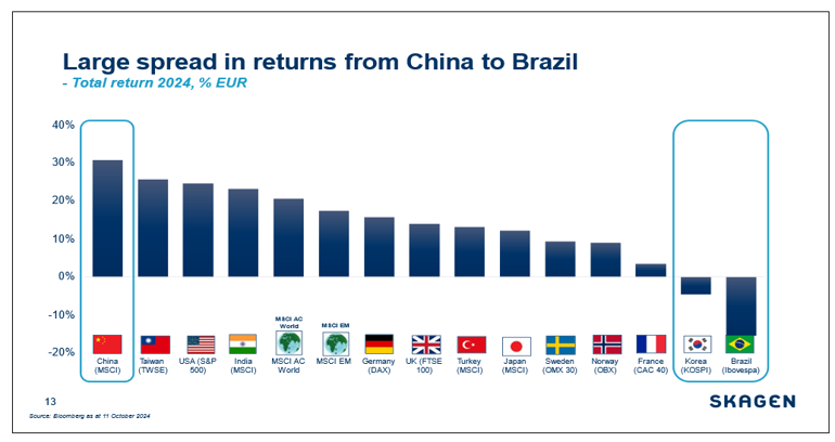 A big chunk of these gains has come from China, which represents 28% of the EM index, where capital has started flowing again as overseas investor sentiment has improved and money has become cheaper to borrow domestically. Fredrik Bjelland, Lead Portfolio Manager of SKAGEN Kon-Tiki, explains: “The Chinese economy has been weaker than expected and so the government launched a co-ordinated policy response with both fiscal and monetary stimulus measures. While support for Chinese households would likely provide even greater impetus, the signal from authorities to support the economy is beyond doubt and gave the Chinese stock market its best week since 2008 at the end of September”.