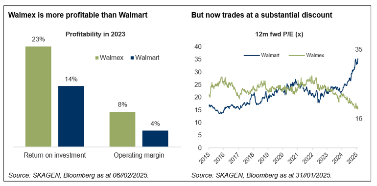 SKAGEN Kon-Tiki recently invested in Mexican retailer Walmex which has historically commanded a premium valuation to parent company Walmart, thanks to its impressive track-record of value creation. This has been eroded over the last 18 months, partly due to the weak Mexican stock market, making the risk-adjusted reward increasingly attractive, as Bjelland explains: “Unlike locally-listed subsidiaries which trade at average premiums of 25% to the parent companies, rising to 250% in India, Walmex is valued at less than half the earnings multiple of Walmart, despite growing faster and being more profitable.”