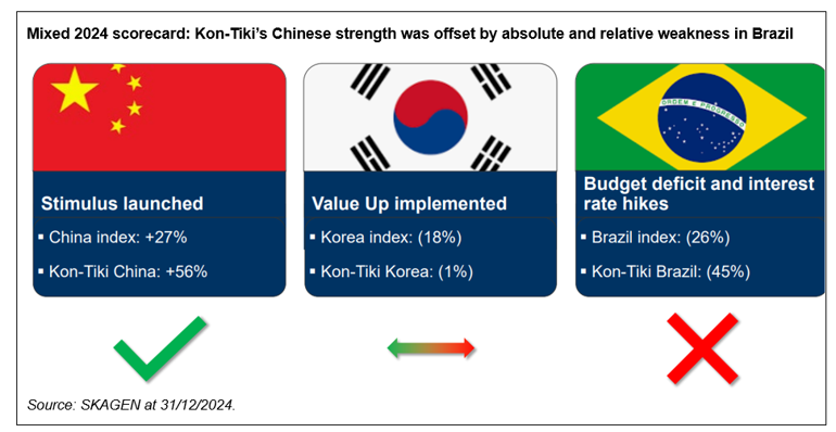 SKAGEN Kon-Tiki has had an even stronger start to the new year, outperforming the EM index by 2.1% net of fees¹. The fund had a challenging 2024 relatively speaking, largely driven by its overweight positioning in Brazil and Korea, two of last year’s worst performing emerging markets with EUR losses of 25% and 18%, respectively.
