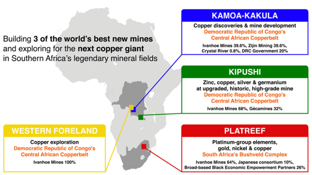Although Ivanhoe is listed in Canada, all the company’s projects are based in South Africa and DRC. Ivanhoe is currently developing three mines with a focus on platinum (Platreef, South Africa), zinc (Kipushi, DRC) and copper (Kamoa-Kakula, DRC) respectively. All the projects have very low operating and capital costs compared to competitors’ mines thanks to their very high metal grade, i.e. the percentage of metal per kilo of rock.