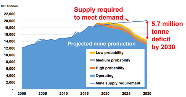 Unfortunately, this expected demand growth is not being met by accelerating supply. Quite the reverse. Due to falling profitability and political resistance to mining development, supply growth has not kept pace with demand.