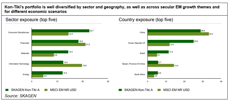 In addition to helpful energy headwinds – SKAGEN Kon-Tiki has 12.2% of assets invested in the sector versus 4.6% of the index – performance was boosted by strong stock selection. This was particularly notable in China where the fund's holdings contributed positive absolute returns and outperformed the weak Chinese market by over 20 percentage points.
