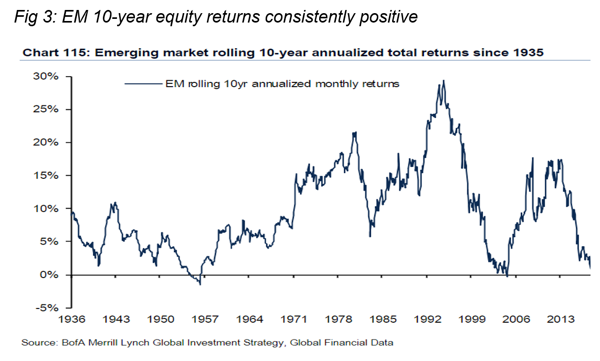 Although the MSCI EM index has only been in existence since 1998, looking back over eighty years shows that emerging market rolling ten-year annualised returns since 1935 have been consistently positive. Investors only lost money in a very small number of ten-year periods around the Second World War and dot-com / Asia crises (see figure 3). Even the most recent decade, which included the Financial Crisis, has been positive for EM investors.