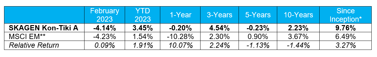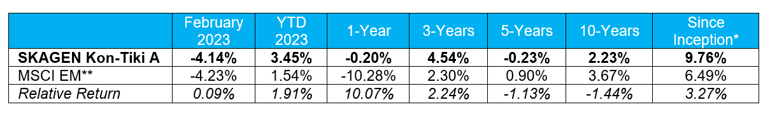 Hyundai drives relative gains and offsets Chinese holdings' weakness. SKAGEN Kon-Tiki was down 4.14% during the month, beating the MSCI Emerging Markets Index which was 4.23% lower. Read the SKAGEN Kon-Tiki February 2023 report for more information.