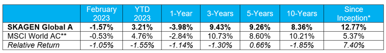 DSV gains offset by Estee Lauder losses as global equities retreat on interest rate fears. SKAGEN Global fell 1.57% during the month, lagging the MSCI All Country World Index which dipped 0.53%. Read the SKAGEN Global February 2023 report for more information.