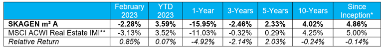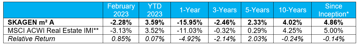 European holdings drive relative strength as rate outlook weighs on real estate markets. SKAGEN m2 fell 2.28% over the month, outperforming the MSCI All Country World Index Real Estate IMI benchmark which lost 3.13%. Read the SKAGEN m2 February 2023 report for more information.