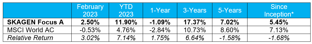 European holdings lead absolute and relative gains as strong fund performance continues. SKAGEN Focus climbed 2.50% during the month, outperforming the MSCI All Country World Index which fell 0.53%. Read the SKAGEN Focus February 2023 report for more information.