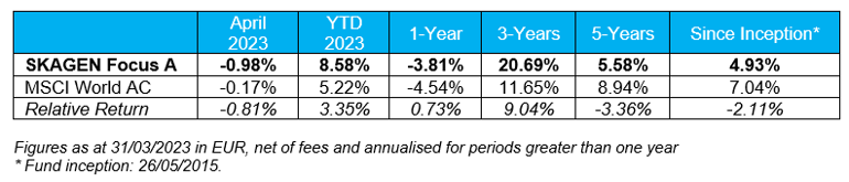Canfor Pulp weakness offset Sao Martinho strength as Persimmon joined portfolio. SKAGEN Focus dipped 0.98% during the month, lagging the MSCI All Country World Index which fell 0.17%. Read the SKAGEN Focus April 2023 report for more information.