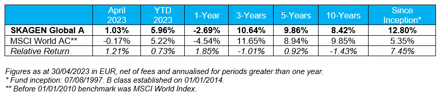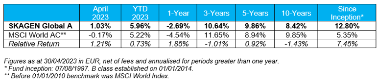 Brown & Brown led absolute and relative gains as holdings reported good Q1 earnings. SKAGEN Global climbed 1.03% during the month, outperforming the MSCI All Country World Index which dropped 0.17%. Read the SKAGEN Global April 2023 report for more information.