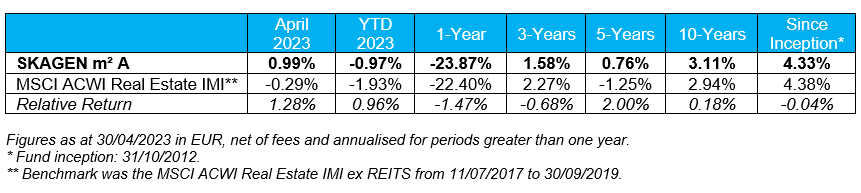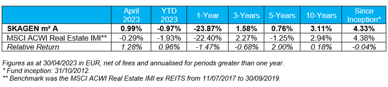 Grainger led absolute and relative gains as European real estate recovery continued. SKAGEN m2 added 0.99% over the month, outperforming the MSCI All Country World Index Real Estate IMI benchmark which dropped 0.29%. Read the SKAGEN m² April 2023 report for more information.