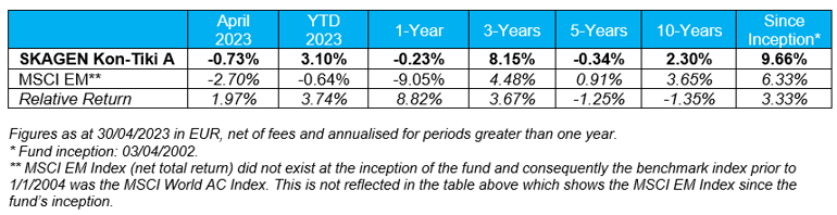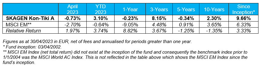 Chinese holdings drove relative strength as Gedeon Richter rejoined the portfolio. SKAGEN Kon-Tiki was down 0.73% during the month, beating the MSCI Emerging Markets Index which was 2.70% lower. Read the SKAGEN Kon-Tiki April 2023 report for more information.