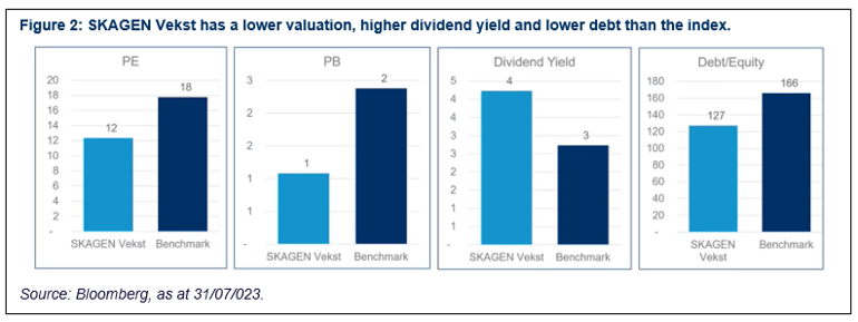 The upshot is a defensively tilted portfolio which has overweight sector positions in consumer staples, materials and energy, and is underweight information technology versus the index. Vekst also continues to have a clear value bias relative to both its Nordic peers and the benchmark (see figure 2), against which it trades at P/B and P/E discounts of 50% and 33%, respectively.
