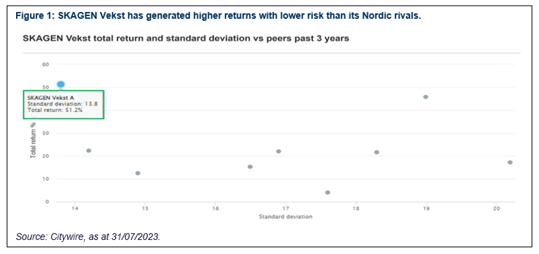 SKAGEN Vekst has performed even more impressively versus other Nordic funds, particularly given their growth bias. Its cumulative three-year return is more than double the average Nordic fund with lower risk, as measured by standard deviation (see figure 1). This has been achieved despite the fund having direct exposure to the Russia-Ukraine war, China-Taiwan tensions and a US banking crisis that Nordic-focused funds avoided, illustrating strong risk management within the portfolio.